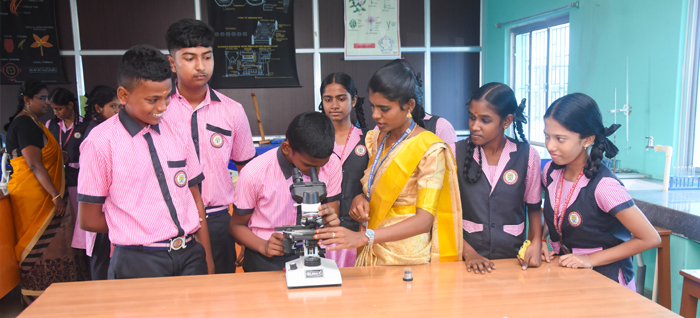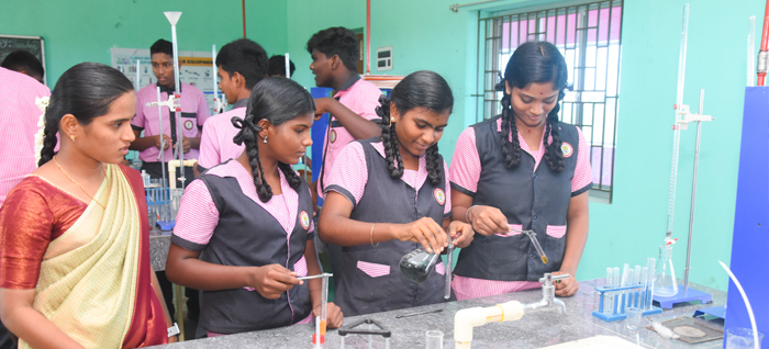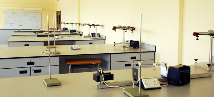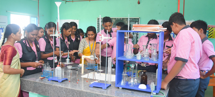 A well-equipped integrated lab where students perform experiments across Physics, Chemistry, and Biology.